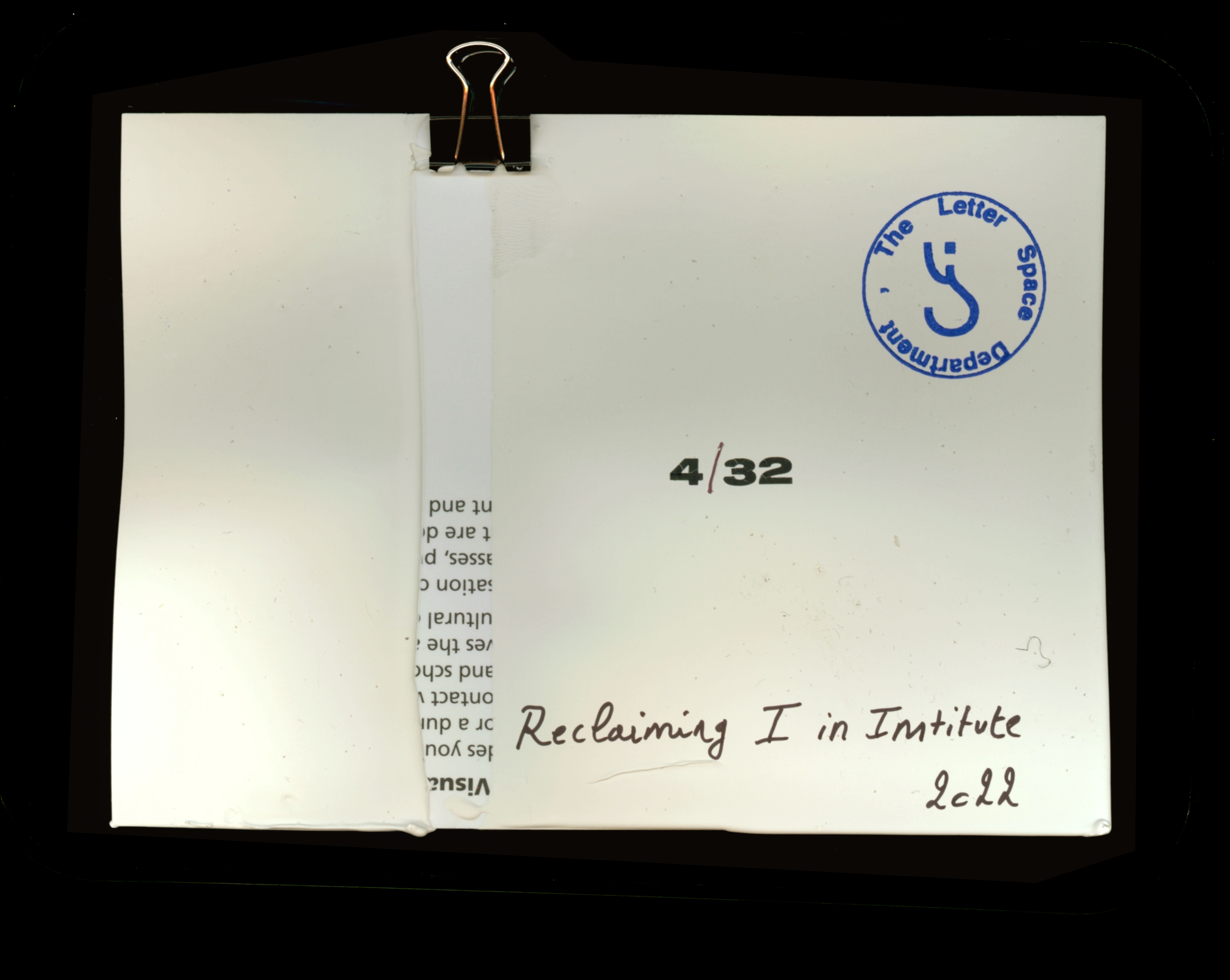 Reclaiming I in Institute (2021) consists of 32 HISK (Hoger Instituut voor Schone Kunsten) postcards partially submerged in white wall paint. The gesture erases the letters H, S, and K, leaving only I to surface—an act of reclaiming presence within the institutional frame. Proceeds from this edition contributed to the founding of The LetterSpace Department’s first program during its residency at HISK.