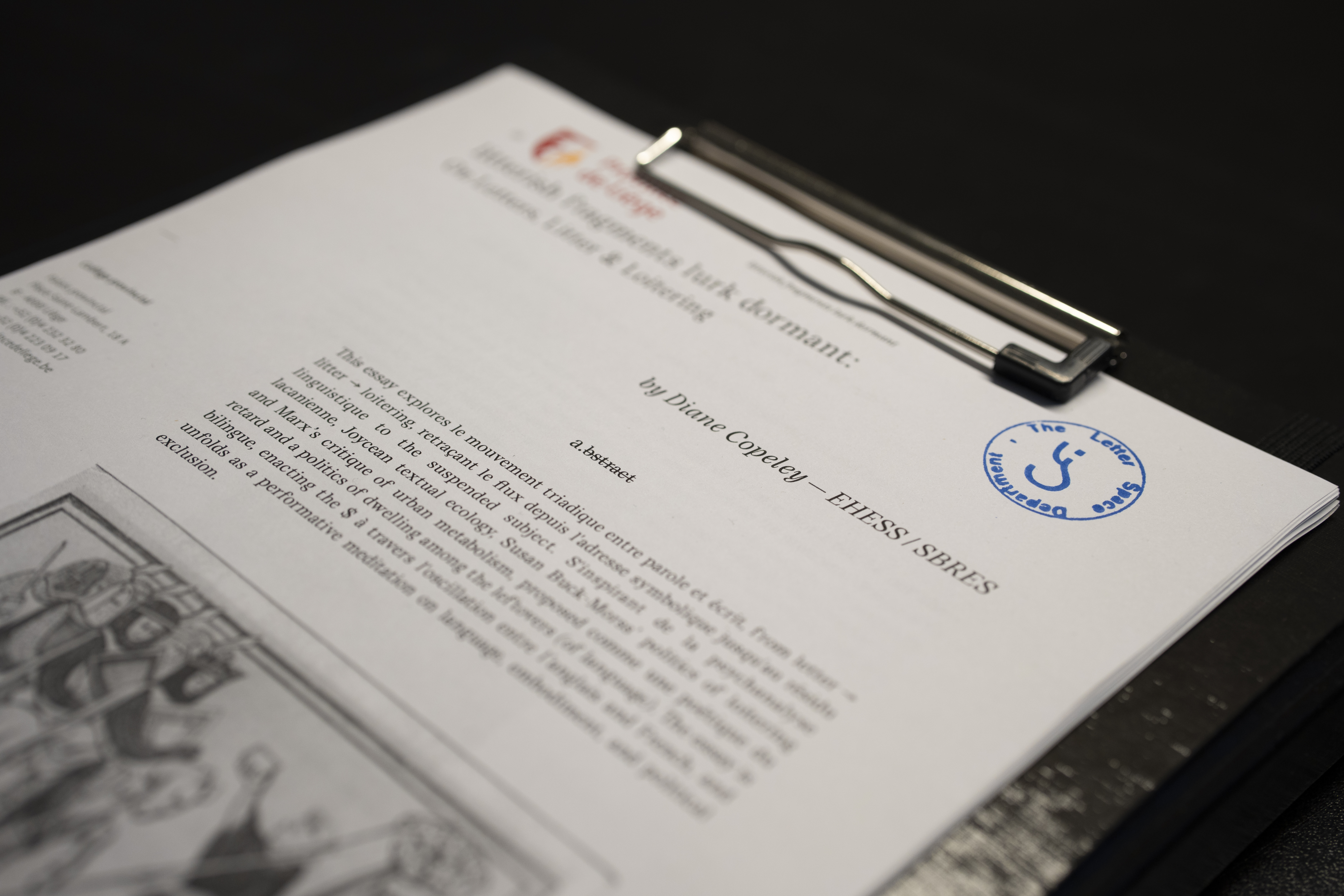 The essay litterish fragments lurk dormant: On Letters, Litter & Loitering by Diane Copeley was voiced on the 13th of december by Antoinette Jattiot & TLSD in the exhibition Adresse/Address, Maison Des Langues, Boulevard d’Avroy 28-30, Liège (BE).
